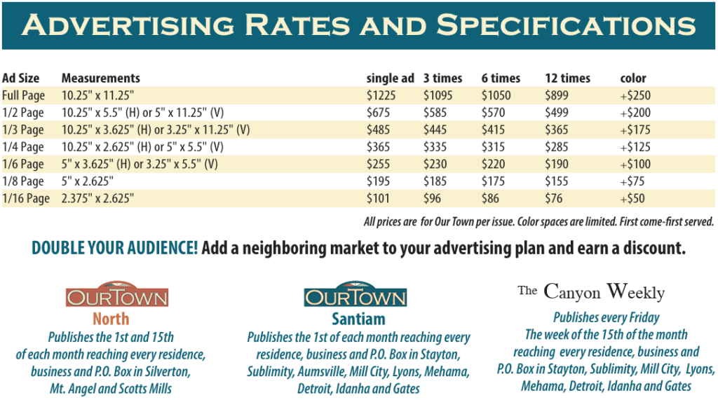 Our Town Santiam publishes on the 1st of the month and ad space reservation are the 20th of the prior month. Space reservations coming in after deadline may be subject to a $25 late charge.