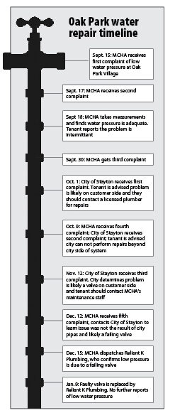 According to the City of Stayton, the public works department was first contacted about water pressure at Oak Park Village Oct. 1, 2025. Interim Public Works Director Barry Buchanan said the resident was advised the city has no oversight of the facility and advised they should contact a licensed plumber for repairs.